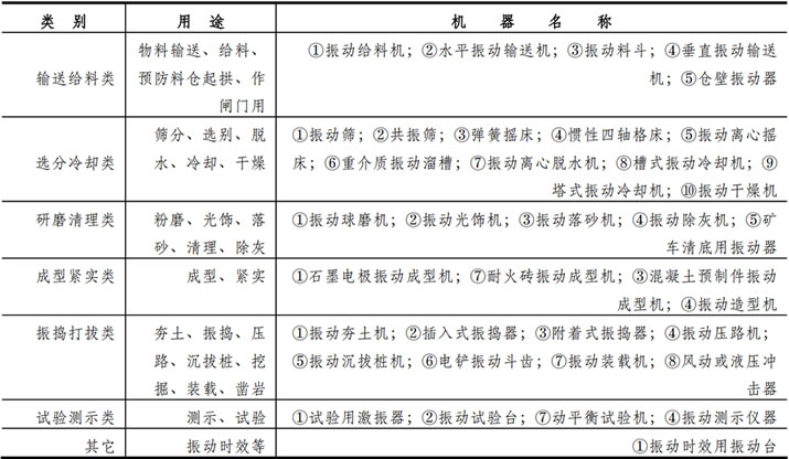 表 l―1 按用途對振動機械進行了分類,并列舉了各種常見振動機械的名稱。